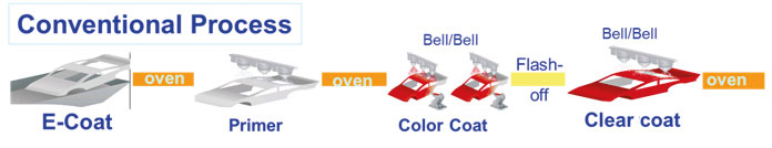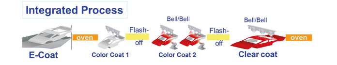 There is a global mega-trend in automobile painting to utilize this integrated painting process. There are many variations of this new process using solvent-borne coatings and water-borne coatings. The painting footprint and applicators continued to be optimized for higher efficiency.